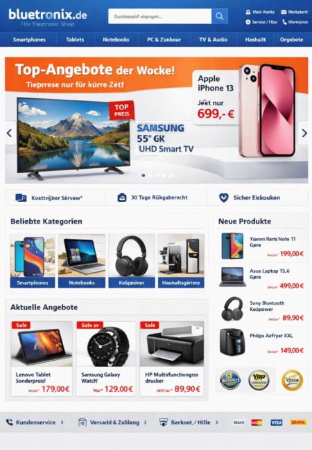 Unterstützt Produkt-Varianten, Lager-Bestände, Rabatte, Bewertungen, Kundenkonten, Newsletter, Statistik und Auswertung.