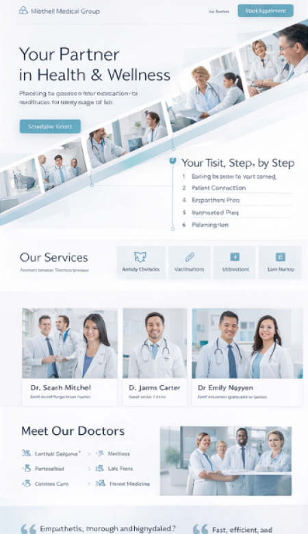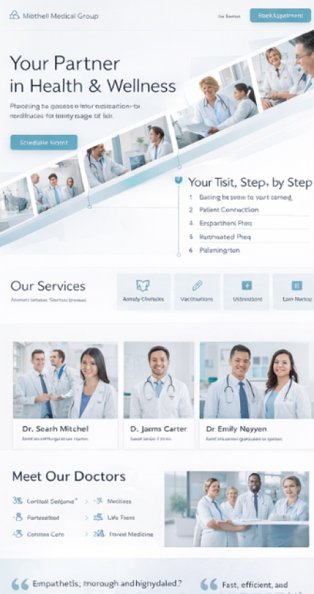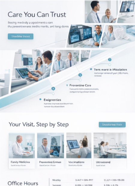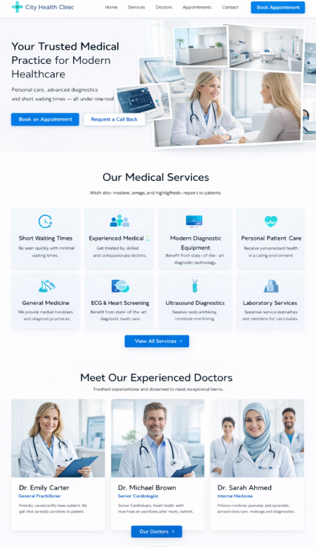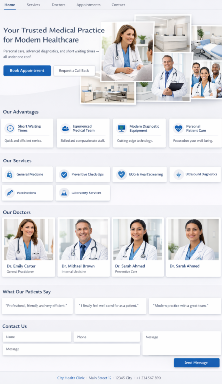 Stellen Sie Ihre Praxis professionell vor: Fachgebiete, Leistungsangebot, Team, Standorte, Sprechzeiten und Kontaktwege. Ergänzen Sie Online-Termine, Formulare für Neupatienten und klare Infos zu Abläufen.Optional mit News-Bereich, Mehrsprachigkeit, geschützten Patientenbereichen und Dokumenten-Seiten (z. B. Aufklärungsbögen, Hinweise, Downloads).