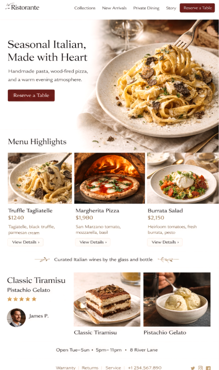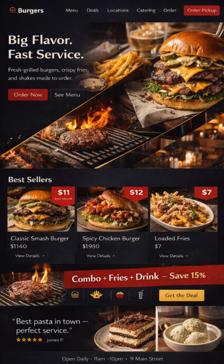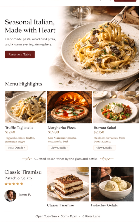 Stell dein Restaurant hochwertig vor: Küche, Team, Öffnungszeiten, Anfahrt, Galerie, Events und Aktionen. Gäste finden alles sofort und kommen schneller zur Reservierung oder Bestellung.Optional mit News-Bereich für neue Gerichte, Aktionen und Event-Abende. Alles pflegbar ohne Technik-Stress und ohne Agentur-Pingpong.