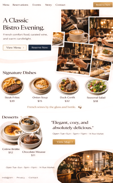 Saubere Struktur für lokale Suche: Öffnungszeiten, Adresse, Karte, Bilder, FAQs. Damit Gäste dich schneller finden und schneller reservieren.