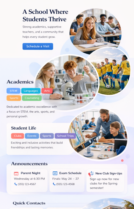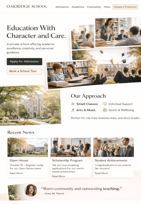 Stellen Sie Schule oder Hochschule professionell vor: Leitbild, Ansprechpartner, Fachbereiche, Termine, Downloads, Anfahrt. News lassen sich mit Archiv führen, damit Infos langfristig auffindbar bleiben.Klassenfotos und Projekte können als Galerien dargestellt werden – mit Freigaben und optionalen Sichtbarkeiten je Bereich. Das Ergebnis wirkt modern und bleibt für Nutzer leicht verständlich.